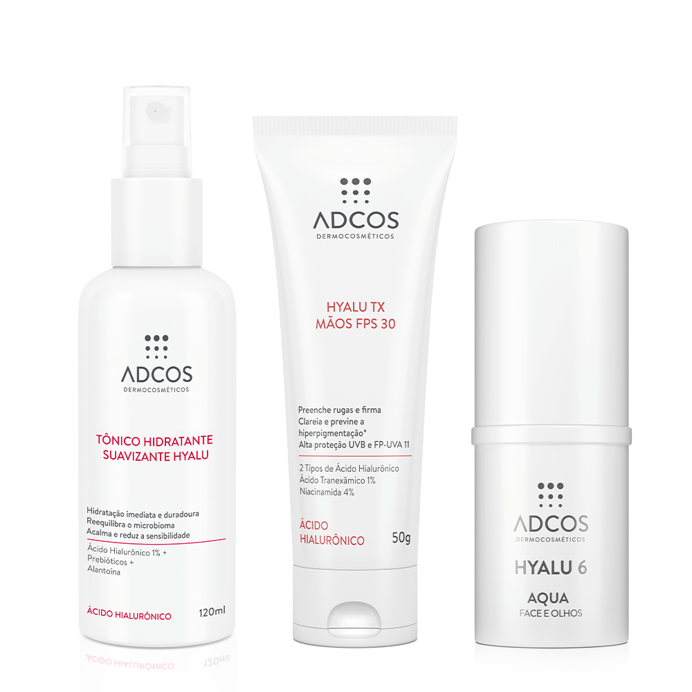 HYALU 6 AQUA FACE E OLHOS: Ácido Hialurônico com textura Water Stick com 1,5% de ácido hialurônico, que preenche rugas, promove frescor imediato e hidratação profunda. Com 4 tipos de Ácido Hialurônico e 2 bioestimuladores, reduz os sinais do envelhecimento, proporciona efeito volumizador, aumenta a firmeza e a luminosidade da pele.