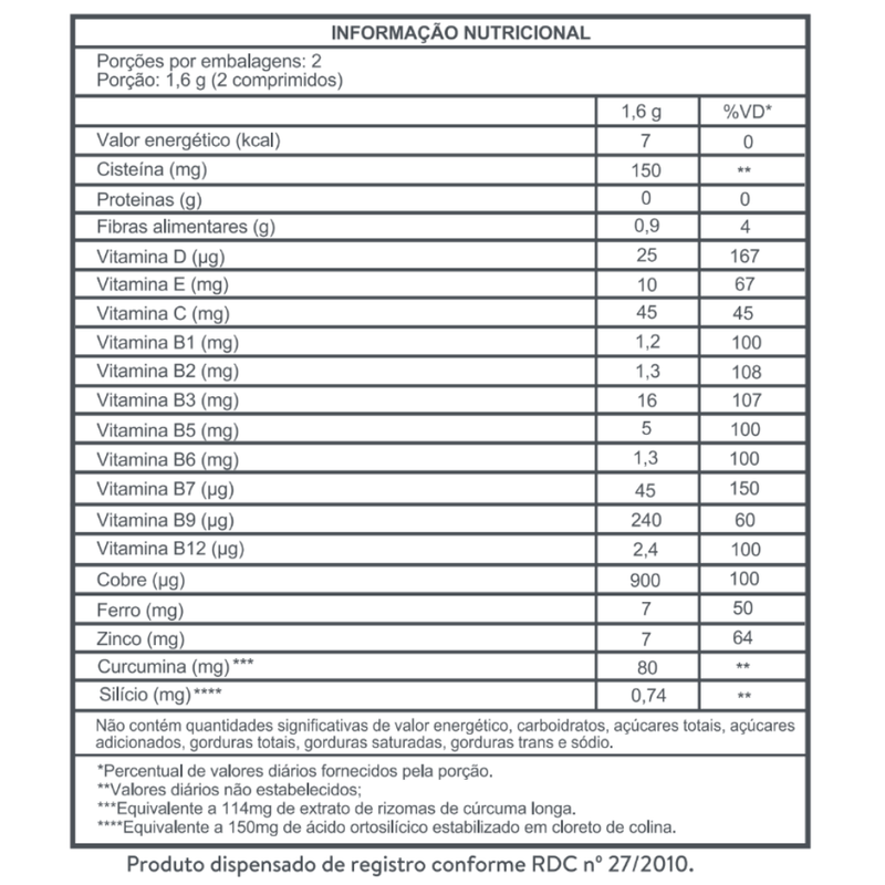 Adcos Nutri Cabelos, Pele e Unhas: ÁCIDO ORTOSILÍCICO ESTABILIZADO EM CLORETO DE COLINA, L- CISTEÍNA, EXTRATO DE RIZOMAS CÚRCUMA, AMIDO MODIFICADO, VITAMINA C, BISGLICINATO FERROSO (FERRO), BISGLICINATO DE ZINCO (ZINCO), ACETATO DL ALFA TOCOFEROL (VITAMINA E), NICOTINAMIDA (VITAMINA B3), COLECALCIFEROL (VITAMINA D3), PANTOTENATO DE CÁLCIO (VITAMINA B5), CIANOCOBALAMINA (VITAMINA B12), SULFATO CÚPRICO (COBRE), CLORIDRATO DE PIRIDOXINA (VITAMINA B6), TIAMINA MONONITRATO (VITAMINA B1), RIBOFLAVINA (VITAMINA B2), ÁCIDO FÓLICO (VITAMINA B9), BIOTINA (VITAMINA B7), ESTABILIZANTES: CELULOSE MICROCRISTALINA E CROSCARMELOSE SÓDICA, EXPESSANTES: HYDROXYPROPILCELULOSE E HYDROXYPROPILMETILCELULOSE, ANTIUMECTANTES: TALCO, DIÓXIDO DE SILÍCIO E ESTEARATO DE MAGNÉSIO, CORANTES, ÓXIDO DE FERRO PRETO, VERMELHO E AMARELO.
