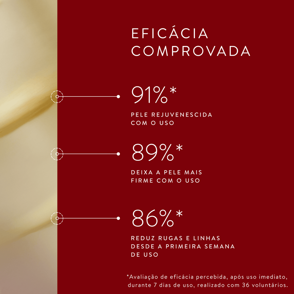 Para intensificar o rejuvenescimento da pele, sua fórmula conta, ainda, com o Retinol, Vitamina E e Adenosina, que proporcionam um boost de energia celular, aumentam a firmeza, a elasticidade, previnem e reduzem rugas, linhas de expressão, com ação antioxidante, cicatrizante e regeneradora.