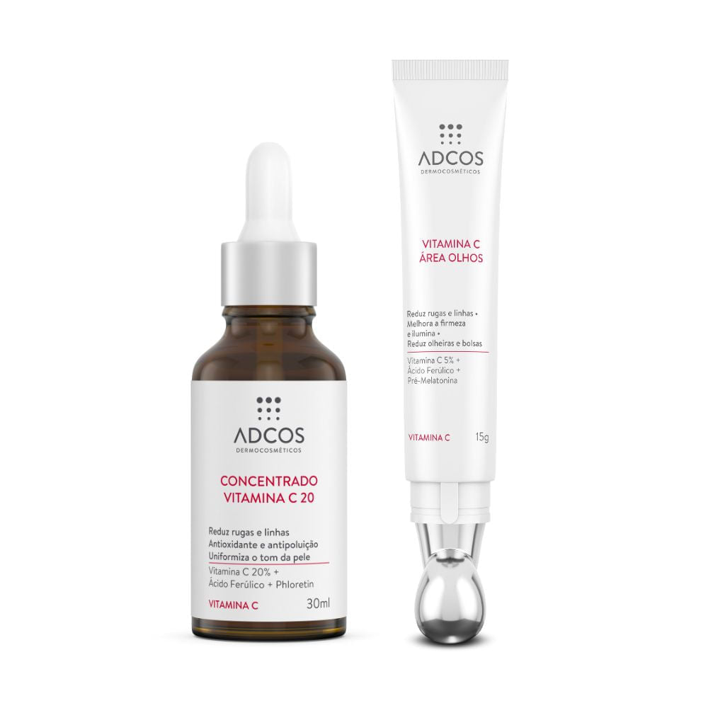 CONCENTRADO VITAMINA C 20 - Ácido L-ascórbico + Vitamina C vetorizada em silício + Vitamina C glicosilada: combinação de 3 diferentes tipos de vitamina C a 20% para máximos resultados. A Vitamina C pura age de forma imediata, a Vitamina C vetorizada em silício atua profundamente na pele e a Vitamina C glicosilada é liberada de forma prolongada. Juntas, estimulam a síntese de colágeno, reduzindo as rugas e reforçando a sustentação e firmeza da pele. Garantem forte ação antioxidante, prevenindo e combatendo o envelhecimento; proporcionam clareamento da pele. - Ácido Ferúlico: possui atividade antioxidante, neutralizando os radicais livres, compostos relacionados com o envelhecimento das células. Potencializa e estabiliza a vitamina C. - Phloretin: potente antioxidante, previne a formação de radicais livres e a peroxidação lipídica induzida pela radiação UV, evitando o fotoenvelhecimento da pele. Protege o colágeno e elastina contra a degradação. Inibe a atividade da tirosinase, favorecendo o clareamento e uniformização da pele. - Flavonoides do Ginkgo Biloba: forte ação antioxidante, combate os danos causados pelos radicais livres. Melhora a microcirculação da pele. Estimula a produção de colágeno e previne a degradação da elastina (antielastase). - MSM: antioxidante intensivo capaz de inativar os radicais livres. Reduz a reatividade da pele por sua ação anti-inflamatória. Melhora o aporte de nutrientes. Protege e restaura o colágeno. - Silício Orgânico: possui ação reorganizadora da membrana lipídica tornando-a mais resistente ao ataque dos radicais livres. Elemento essencial à formação de colágeno, participa do processo de redução das rugas. VITAMINA C ÁREA OLHOS - Vitamina C + Ácido Ferúlico: estimula a síntese de colágeno, reduzindo as rugas e reforçando a sustentação e firmeza da pele. Possui forte ação antioxidante potencializada pelo Ácido Ferúlico, prevenindo e combatendo o envelhecimento. Revitaliza e clareia a pele. - Extrato da árvore da seda: detoxifica a pele e reverte o envelhecimento causado pela glicação (ação antiglicante protegendo o colágeno contra os danos causados pelo açúcar). Promove uma redução visível dos sinais de fadiga, olheiras e bolsas ao redor dos olhos. Reequilibra a produção de melatonina, responsável por reparar o sistema antioxidante da pele, combatendo o stress oxidativo. - Complexo anti-olheiras: reforça a firmeza e tônus na área ao redor dos olhos, ativa a eliminação dos pigmentos sanguíneos responsáveis pela coloração escura e inflamação local. Ilumina os círculos negros ao redor dos olhos, reduzindo as olheiras. - Luteína: é um extrato purificado natural de luteína extraído da calêndula que melhora a hidratação e a elasticidade da pele, além de promover a atividade antioxidante e fotoprotetora, diminuindo os sinais de envelhecimento precoce. - Rutina: é um flavonoide com benefícios comprovados como antioxidante, vasoprotetor e anti-inflamatório.Modo de Usar
